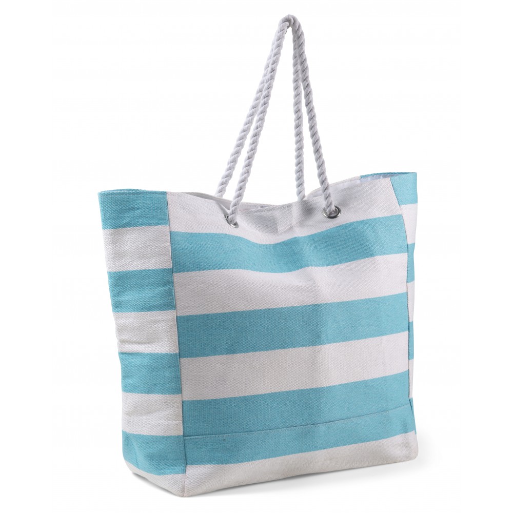 Strandtáska fehér és színes csíkokkal, zsinór fülekkel, belül mágneses patent záródással. Anyaga: pamut, papír, poliészter, vas. Emblémázás: Szitanyomás