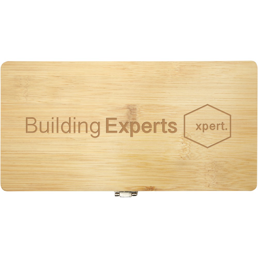 Tapasztald meg a fenntarthatóság és a funkcionalitás tökéletes keverékét a Rivet szerszámkészlettel. Ez az aprólékosan megtervezett eszköztár nem csak látványos, hanem környezettudatos is, anélkül, hogy a minőségben vagy a teljesítményben kompromisszumot kötne. A bambusz természetes ereje és tartóssága biztosítja, hogy szerszámaid hosszú éveken át védve legyenek. A tok belsejében 19 alapvető, szénacélból és újrahasznosított műanyagból készült szerszám található: 1 csavarhúzó, 4 kiváló minőségű végfej különböző felhasználásra, 1 hosszabbító a nehezen elérhető helyekhez, 10 precíziós bitfej bármilyen feladathoz és 3 imbuszkulcs bútorok összeszereléséhez. Legyen szó barkácsolásrajongóról vagy professzionális kereskedőről, ezeket az eszközöket úgy tervezték, hogy megbízhatóan működjenek és ellenálljanak a szigorú használatnak. Mivel a bambusz természetes alapanyag, darabonként előfordulhatnak kis szín- és méretbeli eltérések, ami befolyásolhatja a végső emblémázási eredményt. Fenntartható Emblémázás: Gravírozás