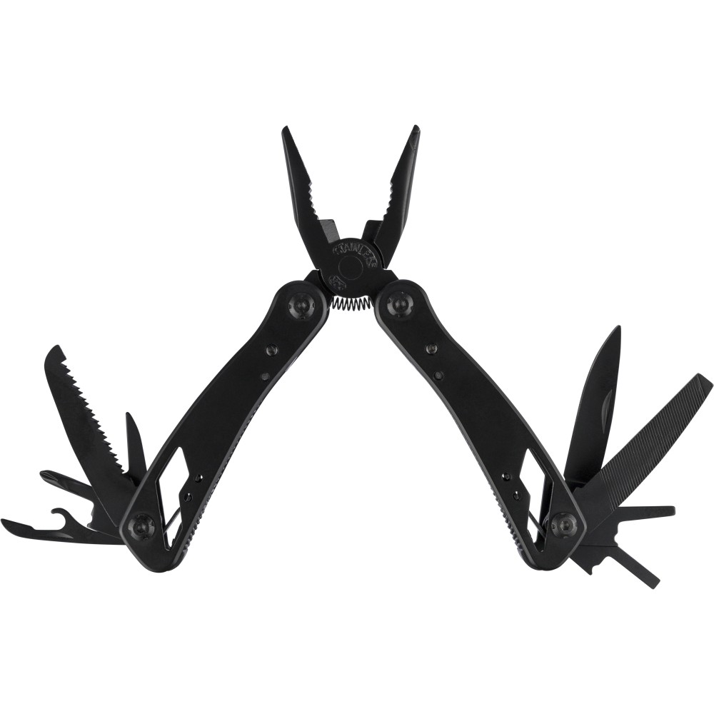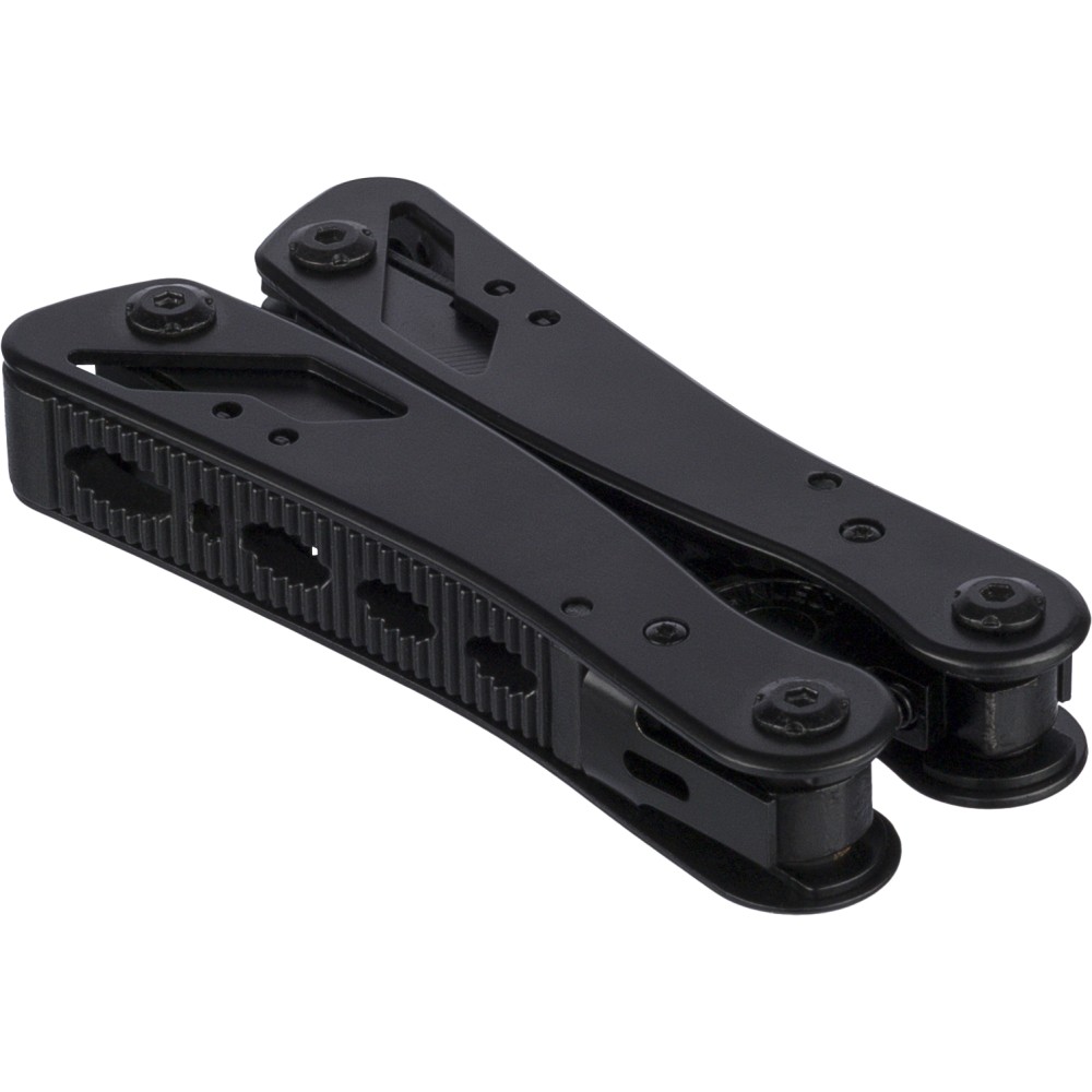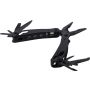 Fekete alumíniumból és rozsdamentes acélból készült multifunkciós szerszám 13 funkcióval, beleértve a késeket, csavarhúzókat, fogót, fűrészt, reszelőt, emelőkart, biteket, rugót, rögzítőrudat, konzervnyitót és támasztékot. Tokkal szállítva, amely tépőzáras övbújtatóval rendelkezik, valamint további külső dobozzal. Darabonként barna kartondobozba csomagolva. Emblémázás: Gravírozás, Tamponnyomás