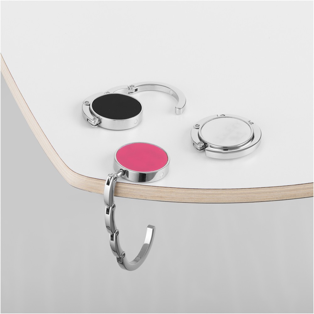 Összehajtható táskaakasztó, mellyel tisztán és biztonságban tarthatja táskáját. Az akasztót bármely felszín peremére felrögzítheti, max. 4,5 kg súlyt bír el. Fekete ajándékdobozban. Emblémázás: Tamponnyomás, UV nyomtatás