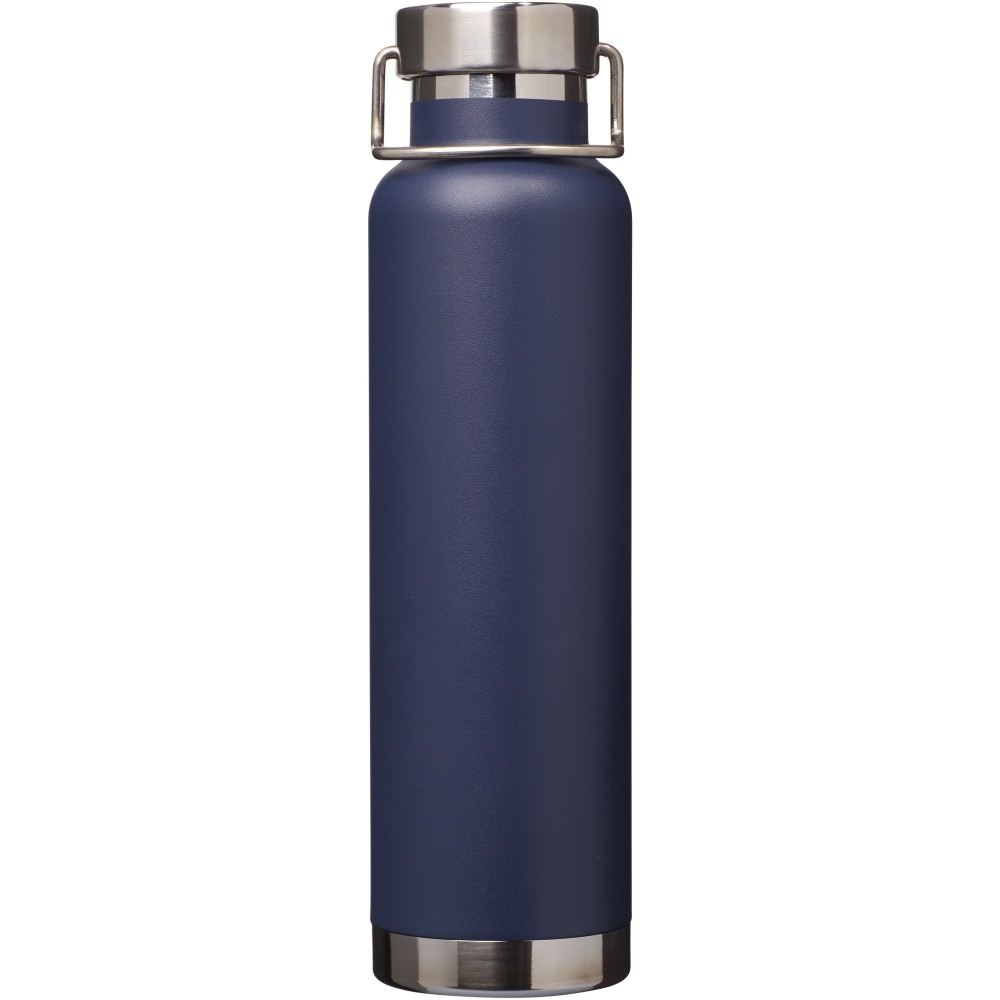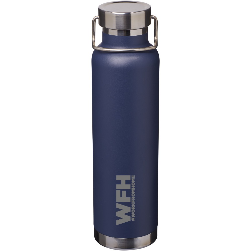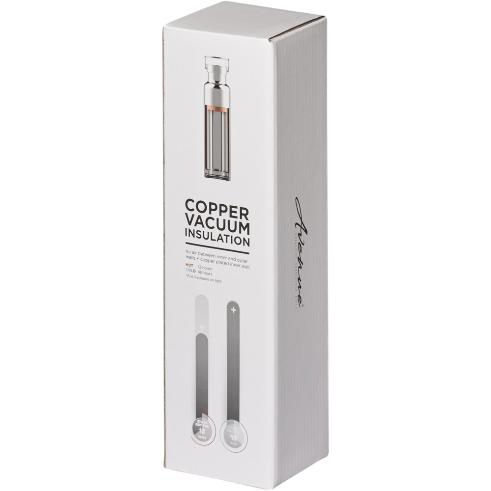 Thor duplafalú vákumos palack. Belső fala réz, ennek köszönhetően 48 órás hideg- és 12 órás melegtartási képességgel rendelkezik. Ez a kialakítás megakadályozza a kondenzációt a palack külső falán. A termoszhoz csavaros, rozsdamentes acél kupak tartozik. Széles kiöntő nyílással rendelkezik, amely akár jégkockák behelyezésére is alkalmas. Szivárgásmentes. Szénsavas italokkal nem használható. Mosogatógépben nem mosható és mikrohullámú sütőben történő melegítésre nem alkalmas. Űrtartalom: 650 ml. Csomagolása Avenue díszdoboz. Rozsdamentes acél. Emblémázás: Gravírozás, Tamponnyomás