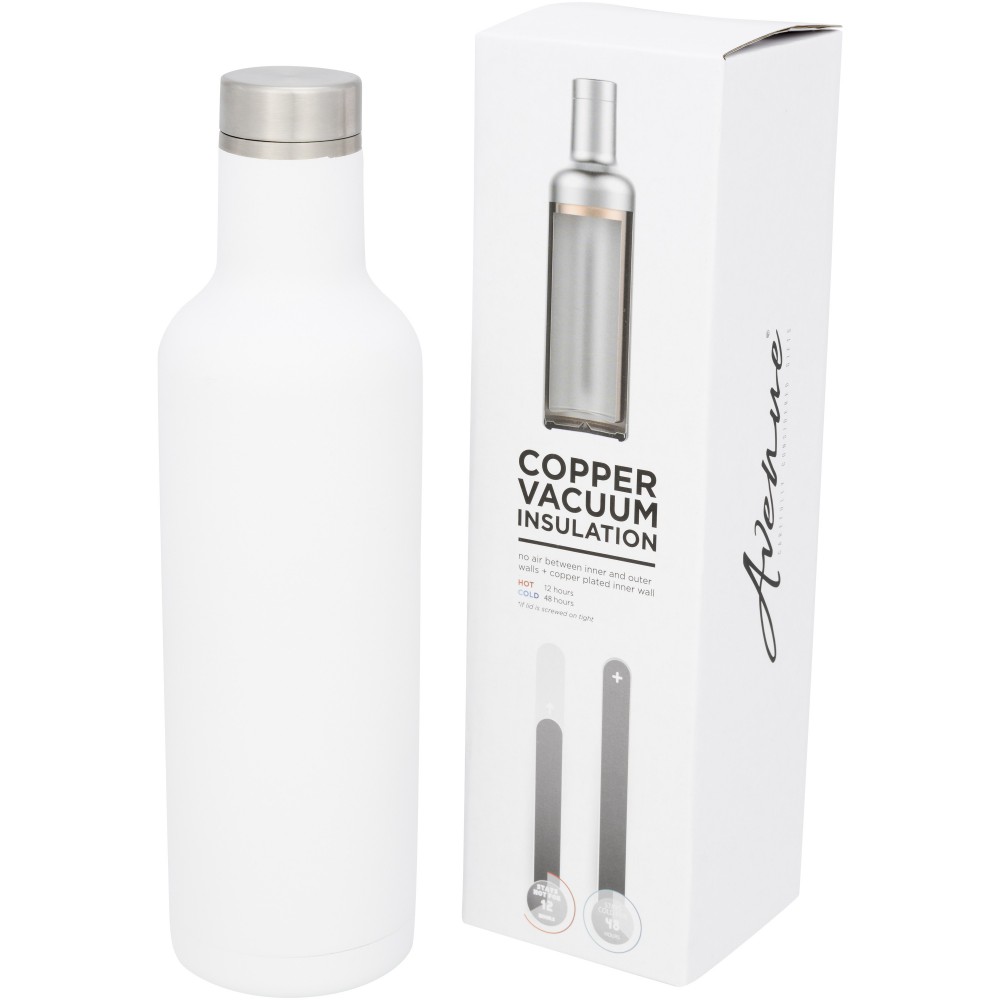 Rozsdamentes, rézbetétes szigetelésű, duplafalú vákumos pohár csavaros fedéllel. Kialakításának köszönhetően a páralecsapódás nem alakul ki. Hőtartóképesség 12 óra, hidegtartó képesség 48 óra. Nem szivárgásmentes. Szénsavas italokkal is használható. Mosogatógépben nem mosható és mikrohullámú sütőben történő melegítésre nem alkalmas. Űrtartalom: 750 ml. Csomagolása Avenue ajándékdoboz. Rozsdamentes acél. Emblémázás: Gravírozás, Körszita
