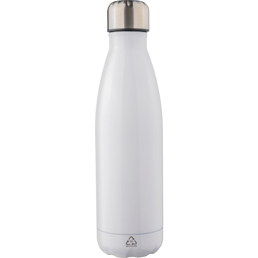 Újrahasznosított rozsdamentes acél, duplafalú kulacs csavaros kupakkal. A belső rész 304-es rozsdamentes acélból, a külső rész 201-es rozsdamentes acélból készült. Az újrahasznosított logó gravírozva van a kulacson. Egyenként barna kartondobozba csomagolva. Űrtartalom: 500 ml. Emblémázás: Bögredekor, Gravírozás
