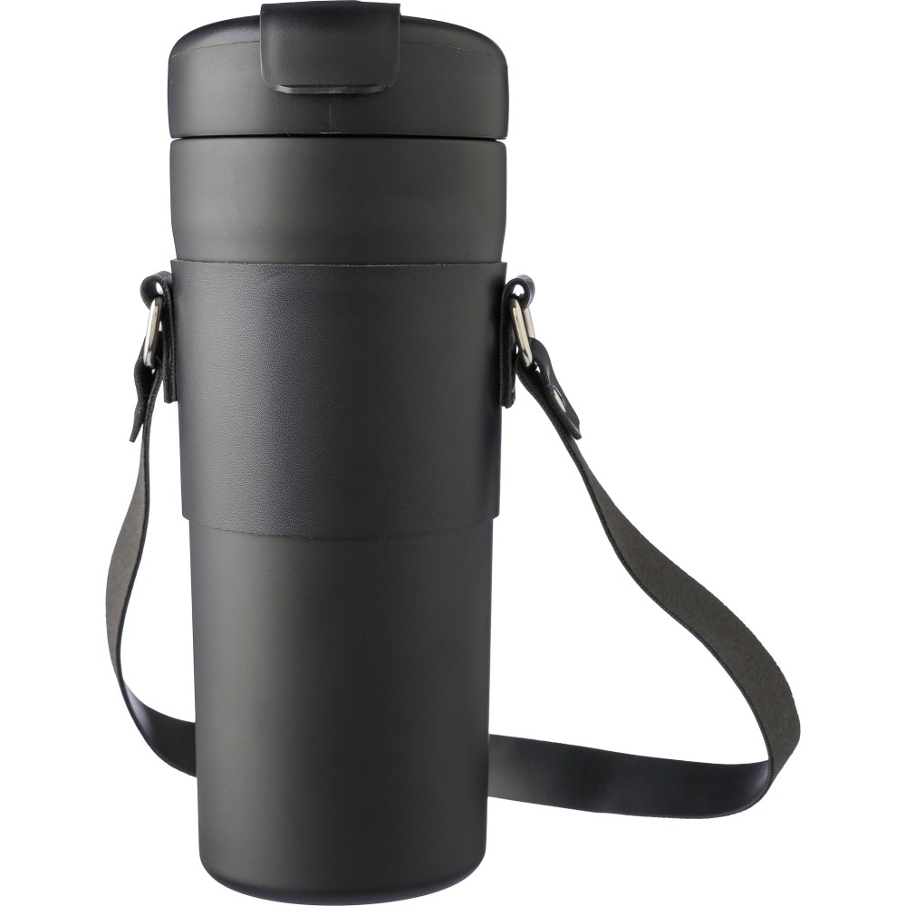 Duplafalú palack PU hordozótokkal, szívószállal és pánttal. A belső rész 304-es rozsdamentes acélból, a külső rész 201-es rozsdamentes acélból készült. PP fedél nyomógombbal a kifolyó nyitásához vagy zárásához, valamint külön ivónyílással. A tartalmát 6 órán át melegen és 10 órán át hidegen tartja. Egyenként barna kartondobozba csomagolva. Űrtartalom: 730 ml. Emblémázás: Gravírozás