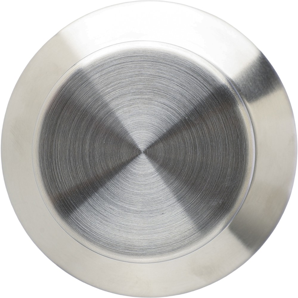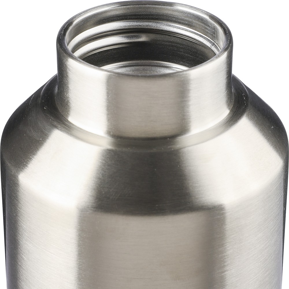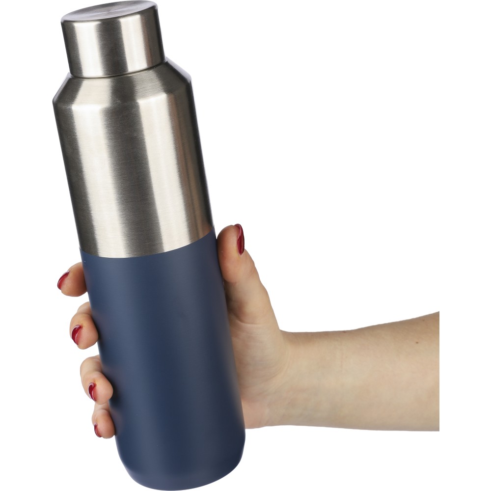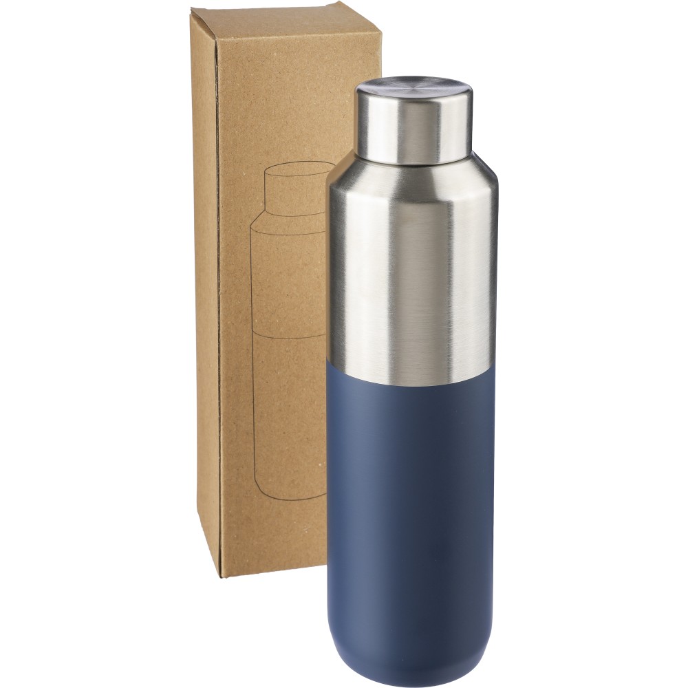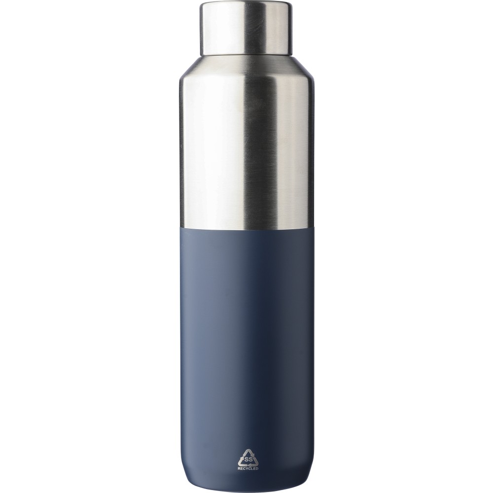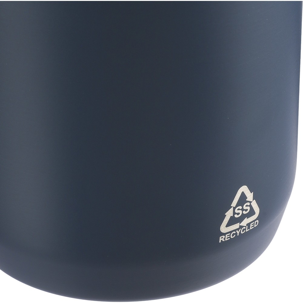Újrahasznosított rozsdamentes acél palack, 600 ml. Duplafalú, vákuumszigetelt, a belső 304-es, a külső pedig 201-es rozsdamentes acélból készült. Kupakja PP, 201-es rozsdamentes acél külsővel. Elején gravírozott újrahasznosított logó található. Csomagolása barna papírdoboz. Emblémázás: Gravírozás, Körszita