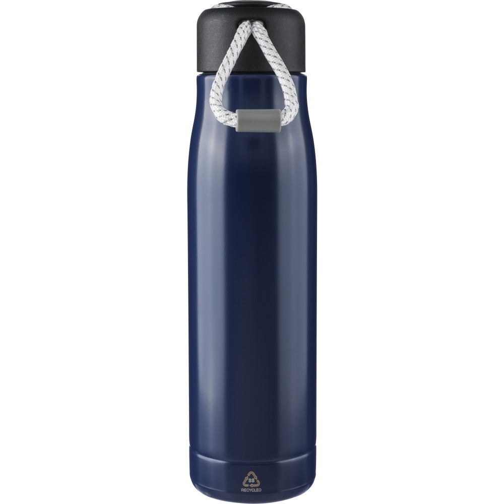 Újrahasznosított rozsdamentes acélból készült duplafalú, vákuumszigetelt termosz, 500 ml-es. Belseje 304-es, külseje 201-es rozsdamentes acél. Csavaros PP kupakkal, poliészter hordozópánttal. Hőszigetelésre és mindennapos használatra tervezve. Az újrahasznosított anyagra utaló gravírozott logóval. Csomagolása barna papírdoboz. Emblémázás: Bögredekor, Gravírozás