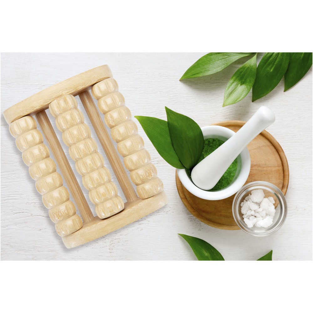 Bambuszból készült talpmasszázs görgő 3 soros masszírozóval. Egyszerűen helyezze a masszírozót a padlóra, majd mozgassa a lábát a kellemes pihentető érzés érdekében. A felhasznált bambusz forrása és előállítása a fenntartható szabványok szerint történik. Emblémázás: Gravírozás