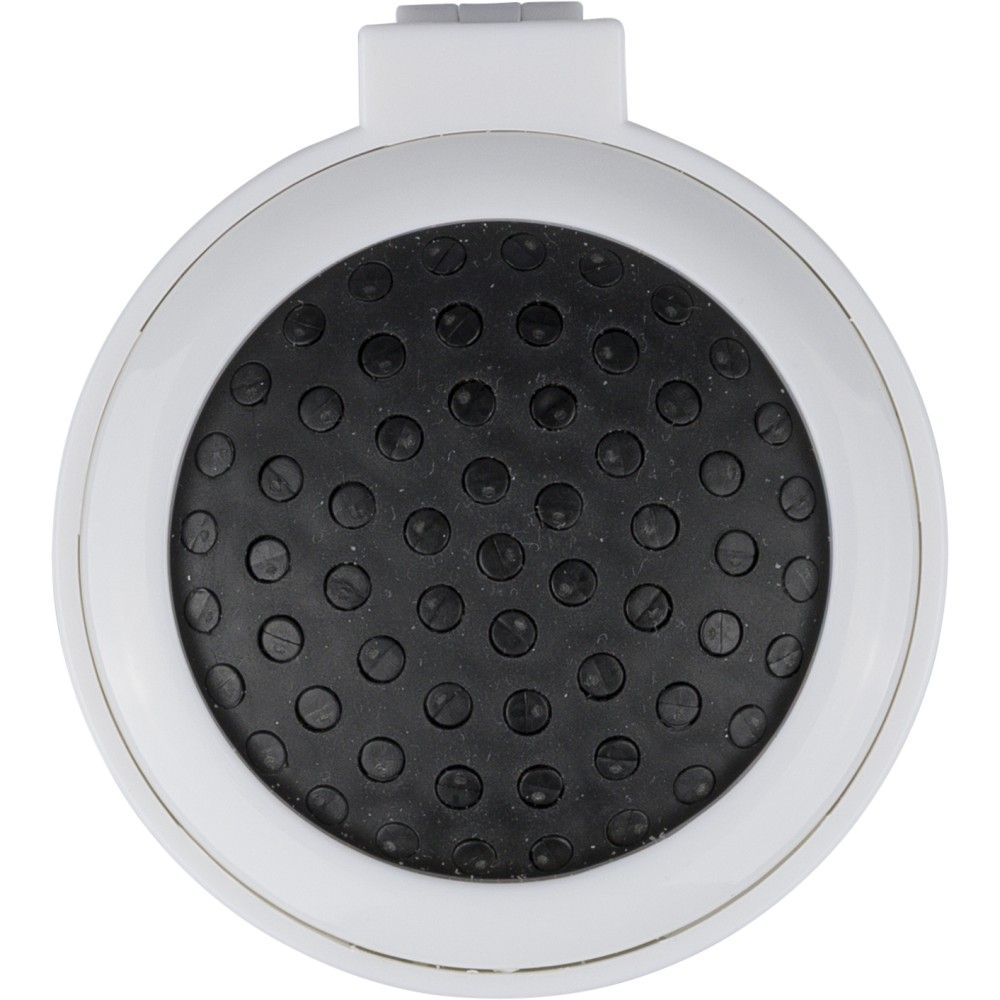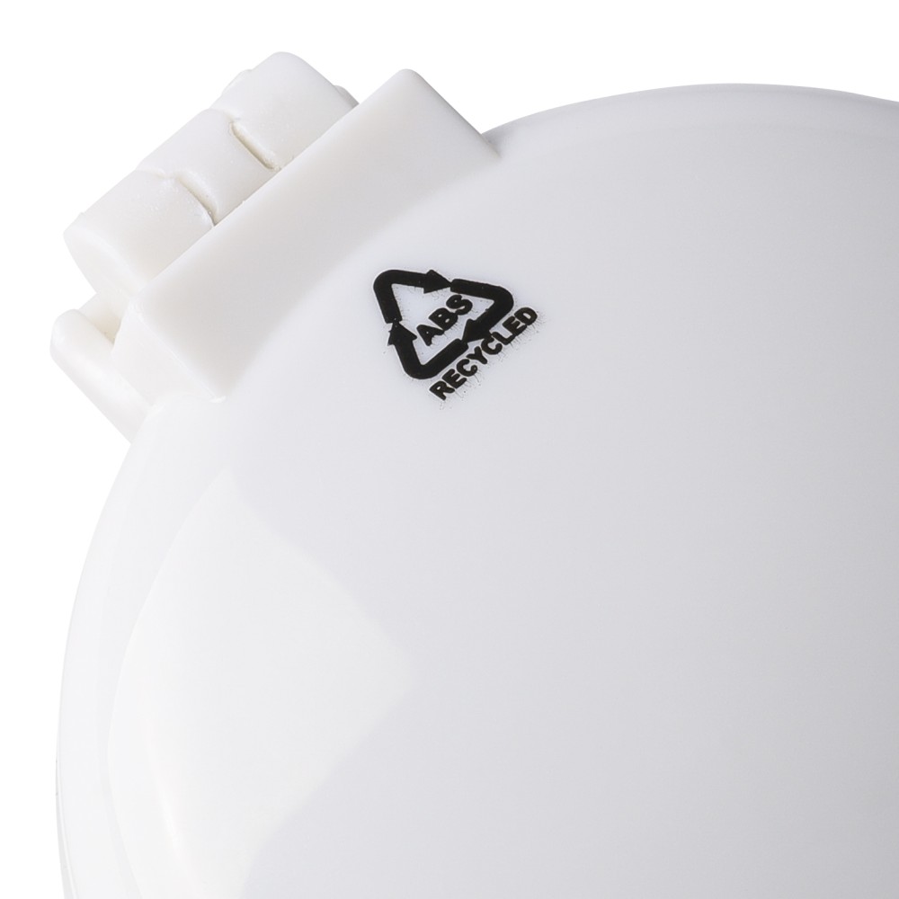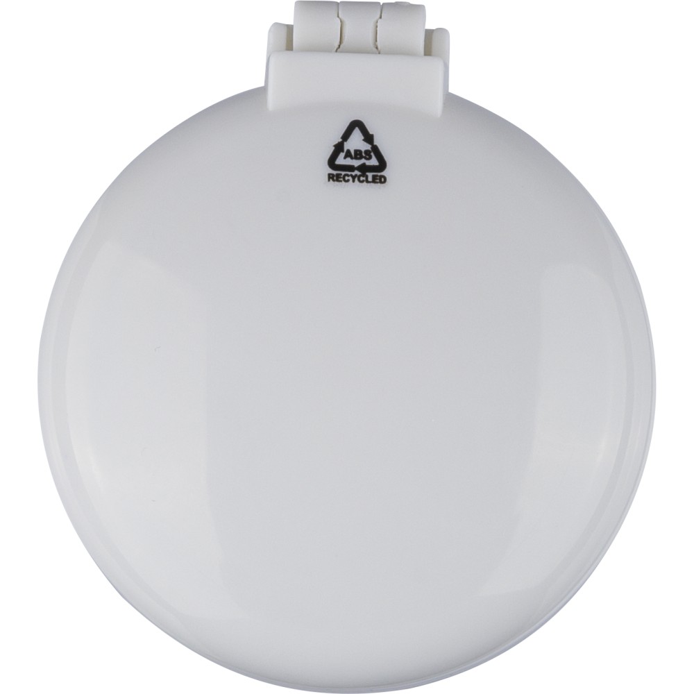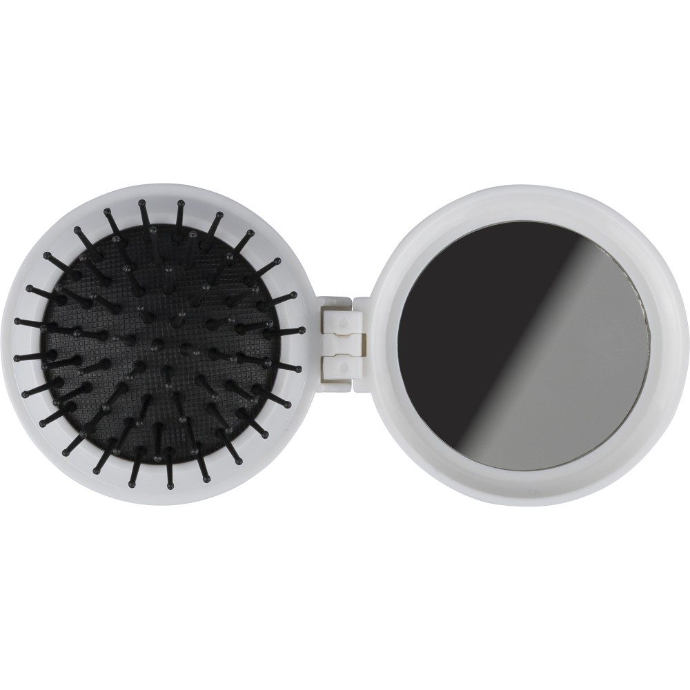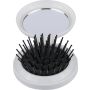Újrahasznosított ABS-ből hajkefe és tükör, praktikus kialakítású útközbeni használatra, a terméken újrahasznosított alapanyagra utaló megjelölés található. Emblémázás: Tamponnyomás