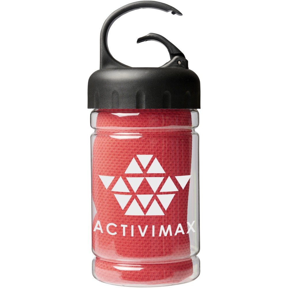 Hűtőtörölköző PET tartóban. A törököző mérete: 30 x 80 cm. 100% poliészter. Emblémázás: Tamponnyomás