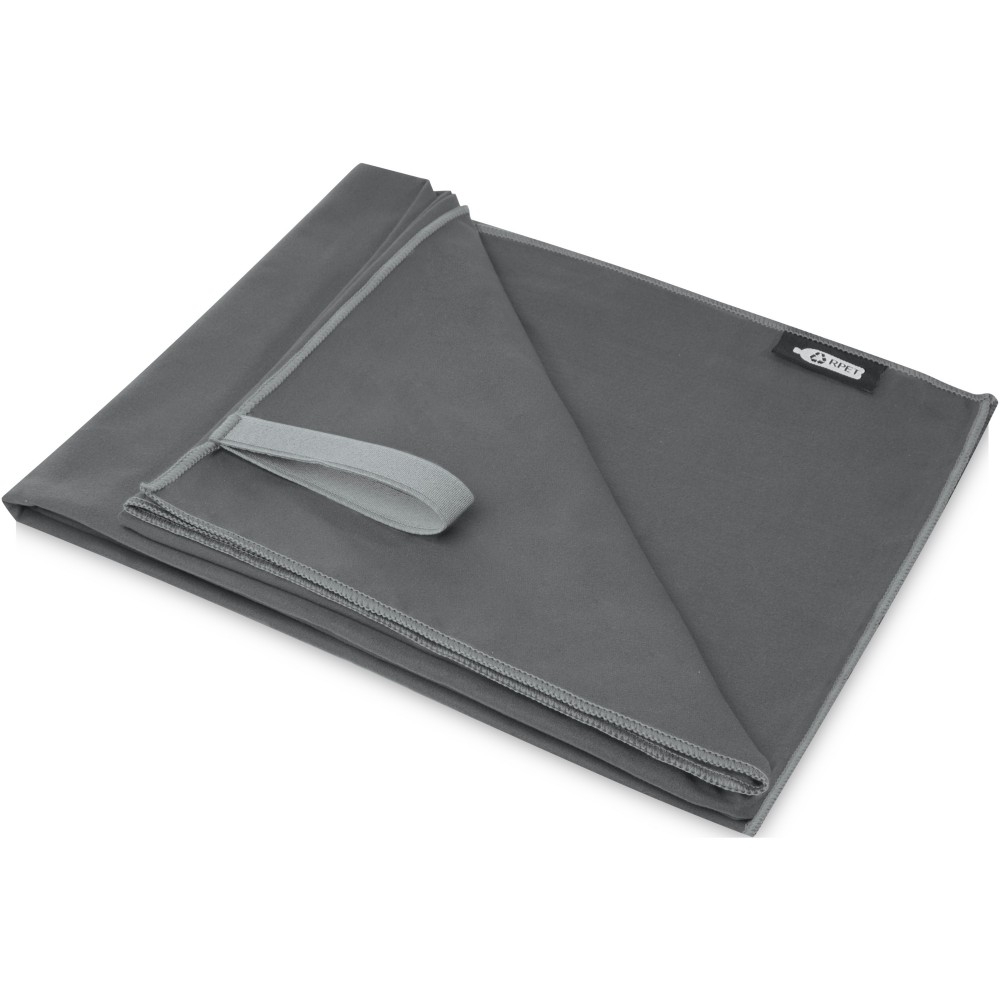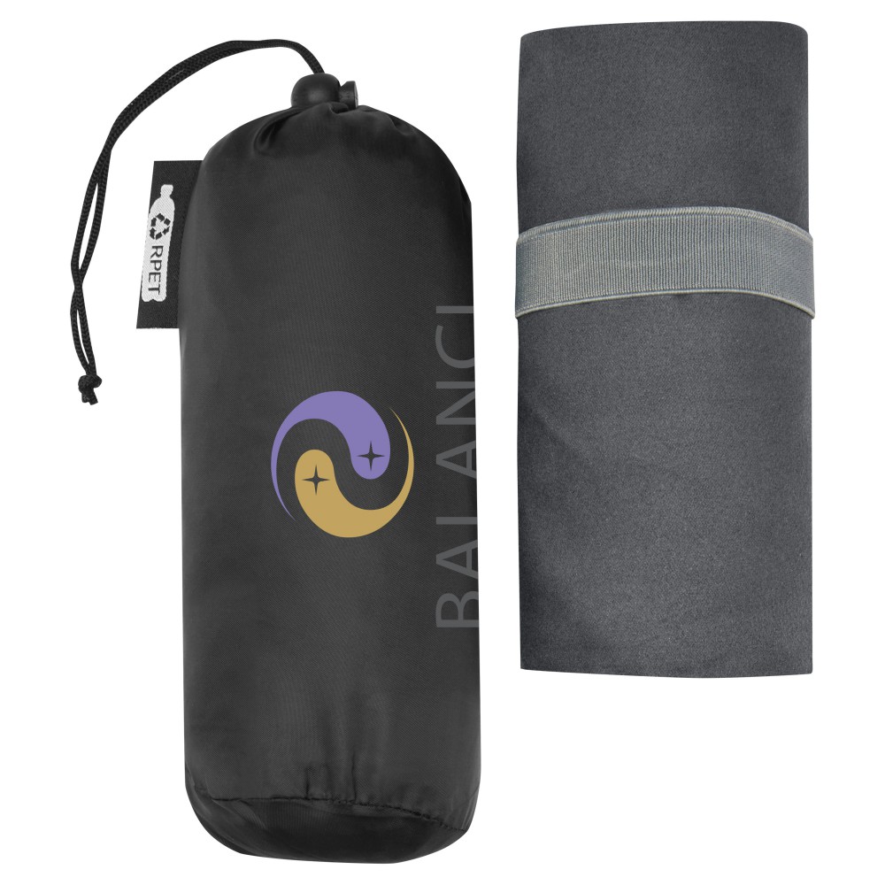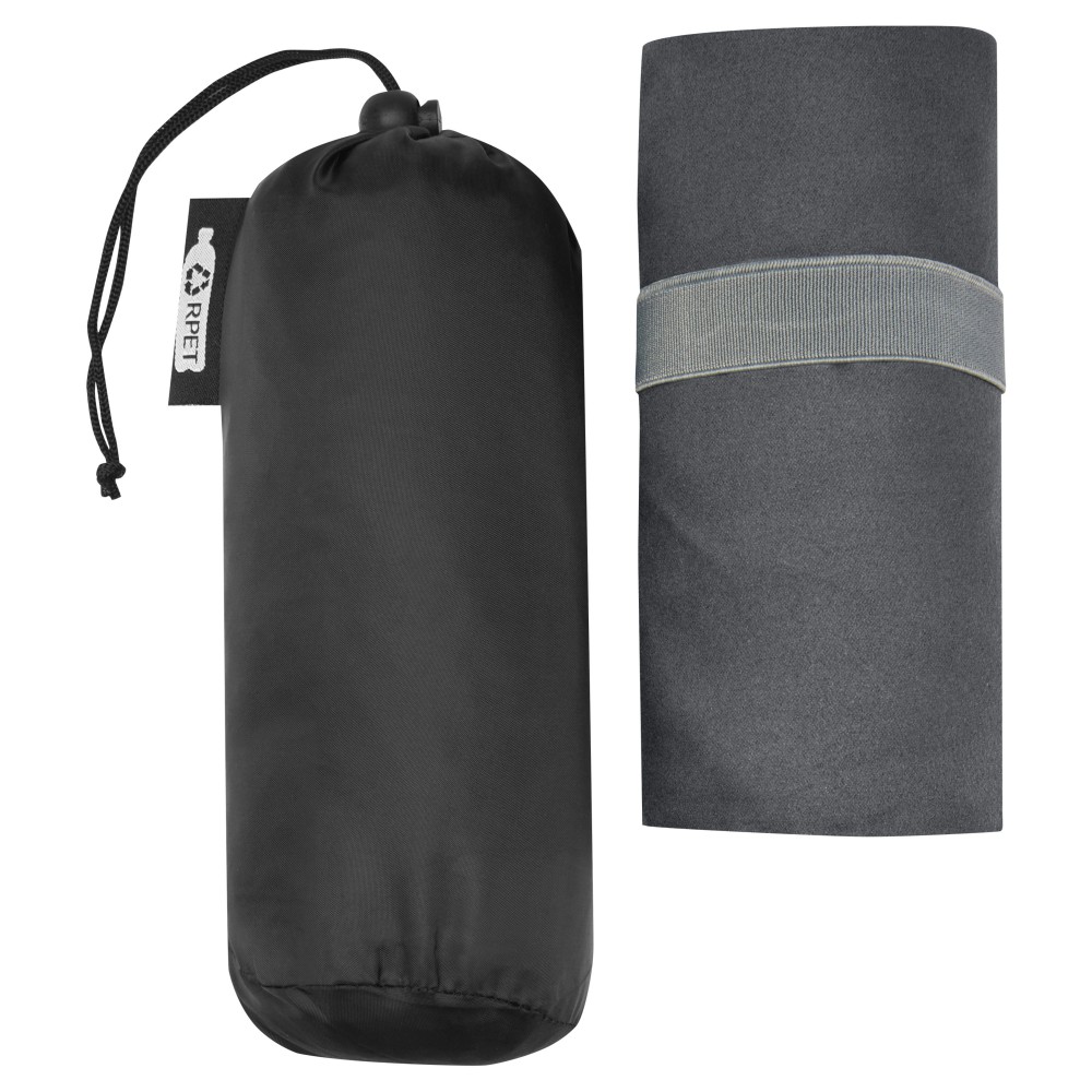 Ez a sporttörölköző nagyon jó nedvszívó, könnyű és gyorsan szárad. Ha a törölközőt összehajtjuk és gumiszalaggal rögzítjük, kis mérete miatt alkalmas edzőterembe, uszodába, vagy kempingezésre. A törölköző 130 x 80 cm méretű, 200 gr/m2-es újrahasznosított PET poliamidból készült, mosógépben 40°C-on mosható. Újrahasznosított PET műanyagból készült tároló tasakkal (20 x 8,5 cm) szállítjuk, amely remek helyet biztosít a logó nyomtatásához. Emblémázás: Hímzés, Szitanyomás