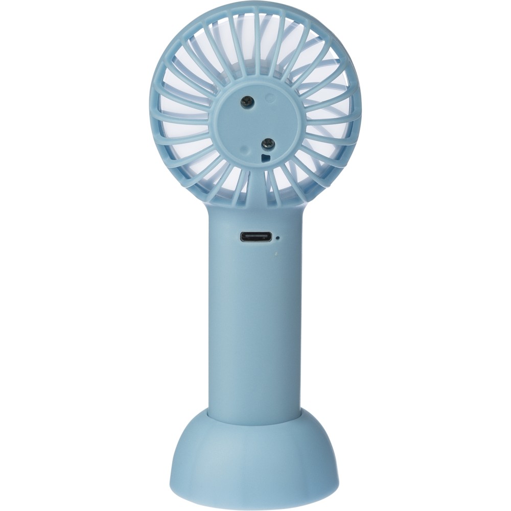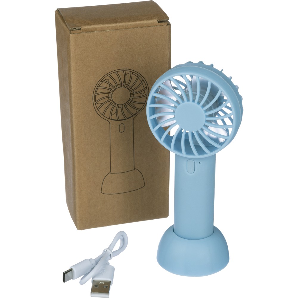 Elektromos kézi ventilátor 600 mAh-s akkumulátorral és C-típusú csatlakozóval és a töltéshez szükséges töltőkábellel. A függőleges használathoz tartozék állvánnyal rendelkezik, de anélkül is használható utazás közben. 3 sebességfokozat. Anyaga ABS. Csomagolása barna papírdoboz. Emblémázás: Tamponnyomás
