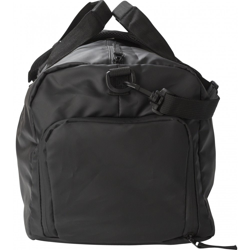 Vízlepergető táska 600D + 210D poliészter anyagból, bevonattal. Fedett cipzárak a vízlepergető funkció megtartása érdekében. Megerősített alj. Állítható pántok, rövid fogantyúk, cipőzseb és mindkét oldalon cipzáras zseb. Szettet alkothat a 1014895 vízlepergető hátizsákkal. Emblémázás: Szitanyomás
