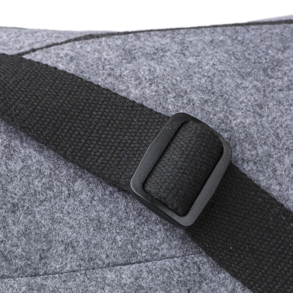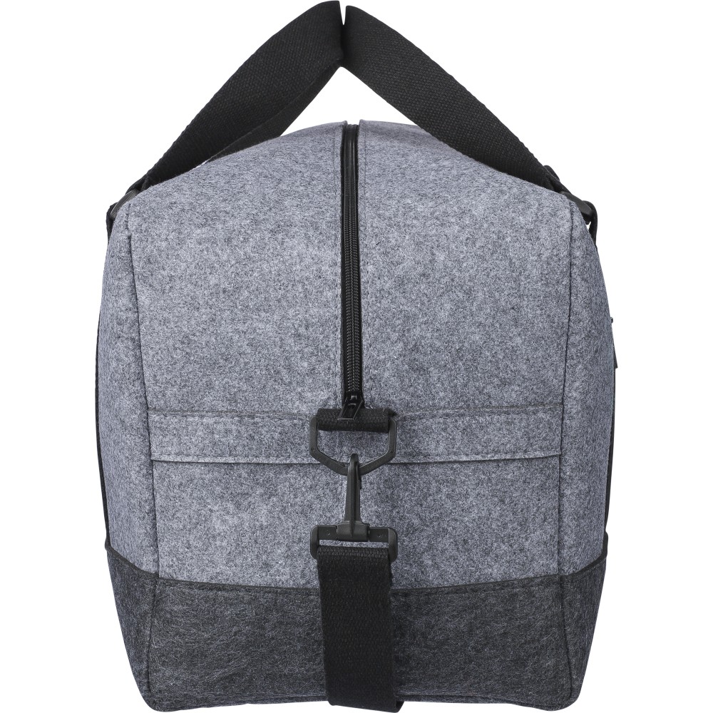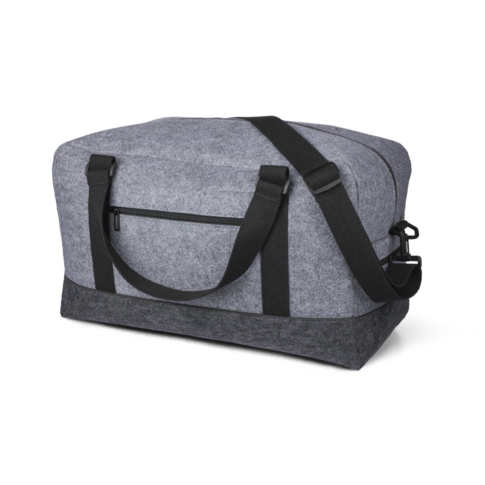Sporttáska rPET filc anyagból vászon fülekkel és állítható vállpánttal. Egy nagy cipzáras rekesszel és a táska elején egy kicsi cipzáras zsebbel. rPET címkével. Úrtartalom: 30 liter, teherbíró képesség: 10 kg. Emblémázás: Szitanyomás