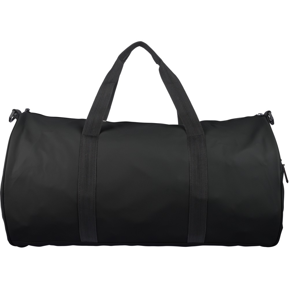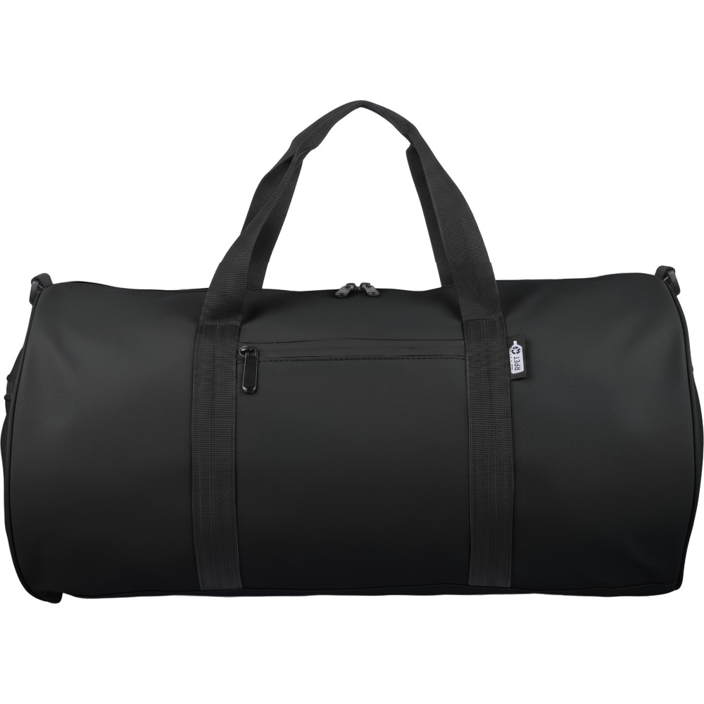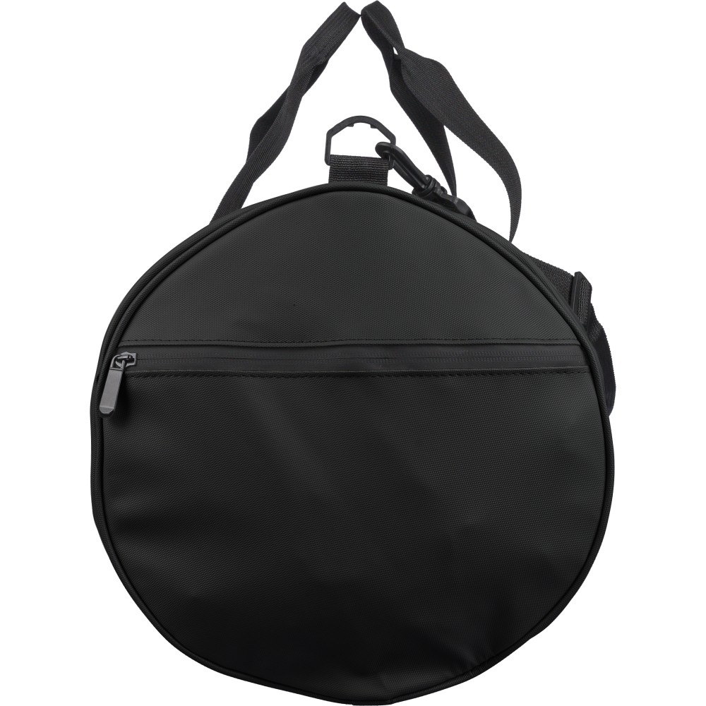 600D poliészterből készült rPET sporttáska 210D béléssel és vízlepergető PU bevonattal, 40 literes űrtartalommal. Elülső és oldalsó cipzáras zsebbel, hálós oldalzsebbel, két fogantyúval és állítható vállpánttal rendelkezik. Külső felületén rPET címkével ellátva. Emblémázás: Szitanyomás