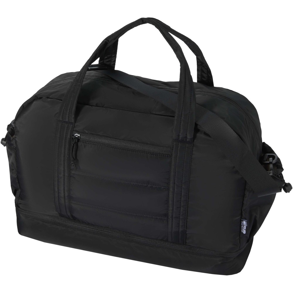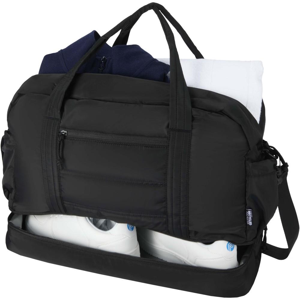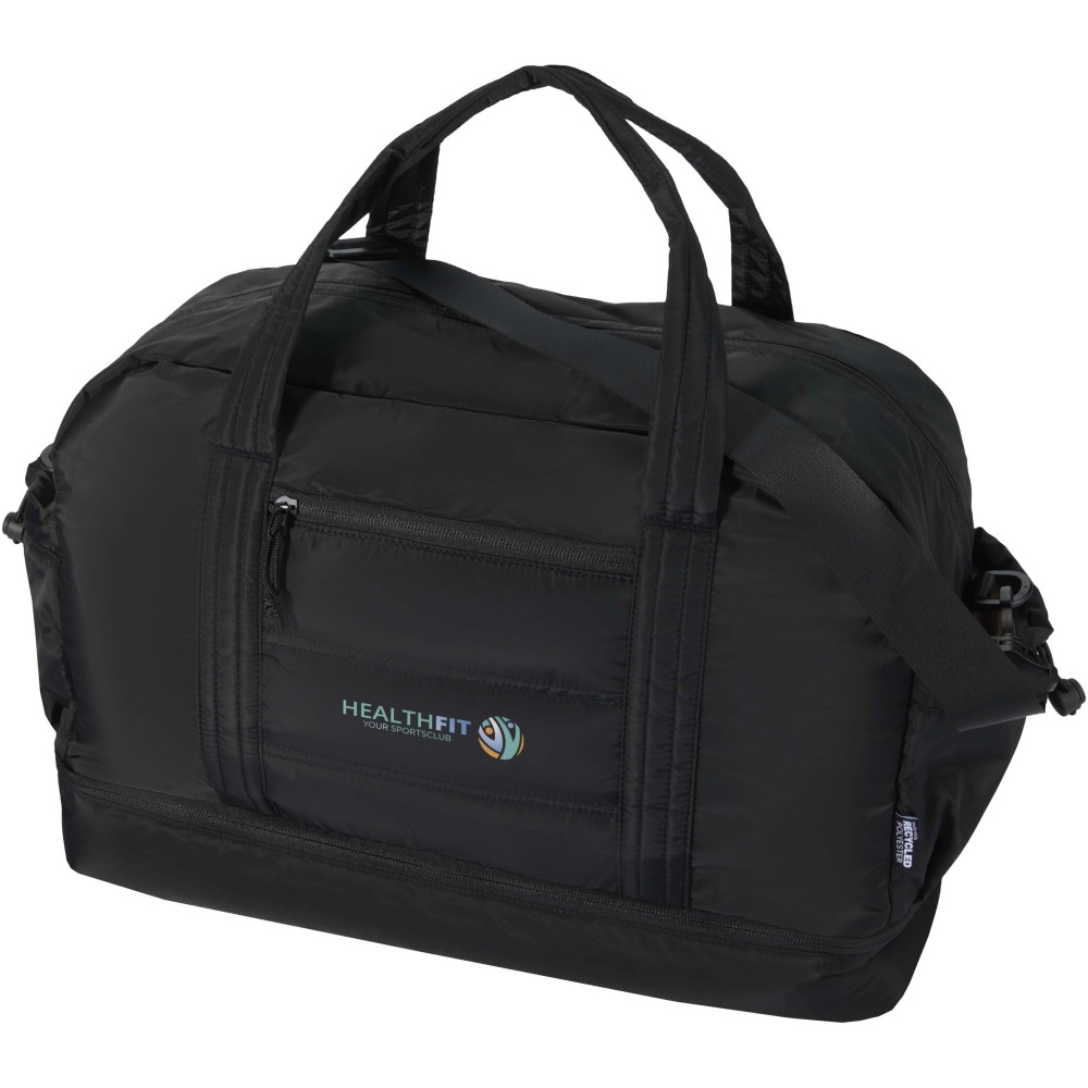 A Puffer sporttáska egyedi megjelenést ötvöz prémium minőségű, GRS tanúsítvánnyal rendelkező újrahasznosított alapanyagokkal, így ideális választás a mindennapi használathoz. A 30 literes űrtartalom tökéletes rövid utazásokhoz, edzéshez vagy hétköznapi teendőkhöz. A táska tágas, cipzáras fő rekesszel rendelkezik ruhák és felszerelések számára, valamint egy szigetelt, PEVA bélésű alsó rekesszel, amely lehetővé teszi a nedves és száraz holmik elkülönítését. A több belső és külső zseb segíti az átlátható rendszerezést, míg a bőröndre rögzíthető pánt, az állítható vállpánt és a kézifogantyúk sokoldalú hordozási lehetőséget biztosítanak. Könnyű és vízlepergető kialakításának köszönhetően ez a sporttáska könnyedén alkalmazkodik az életviteledhez. Emblémázás: Szitanyomás