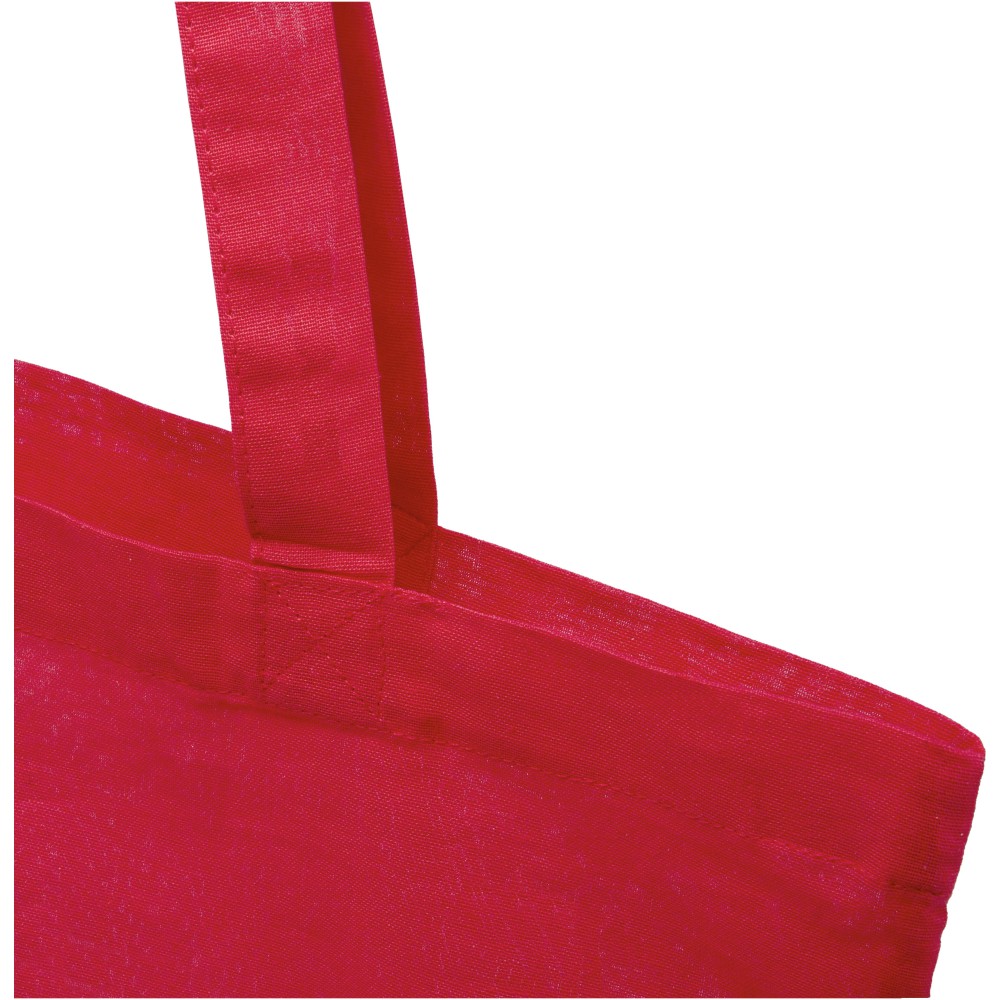 A 100%-ban GRS-tanúsítvánnyal rendelkező újrahasznosított pamutból készült Madras táska tökéletes ajándék bármilyen rendezvényen, konferencián vagy bevásárlótáskaként kisebb élelmiszerek bevásárlásához. A 140 g/m2 pamut sűrűsége a táskát masszívvá, hosszú élettartamúvá és nehéz tárgyak szállítására is alkalmassá teszi a fő rekeszben. A 30 cm hosszú vállpántjával könnyen hordozható. Indiában készült. Teherbírás 5 kg súlyig. Emblémázás: Szitanyomás