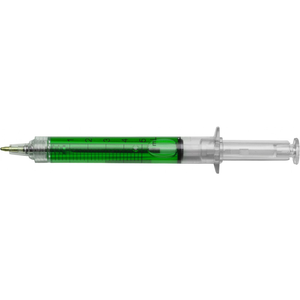 Injekció formájú golyóstoll színes folyadékkal töltve, fekete tollbetéttel. Emblémázás: Tamponnyomás, UV nyomtatás