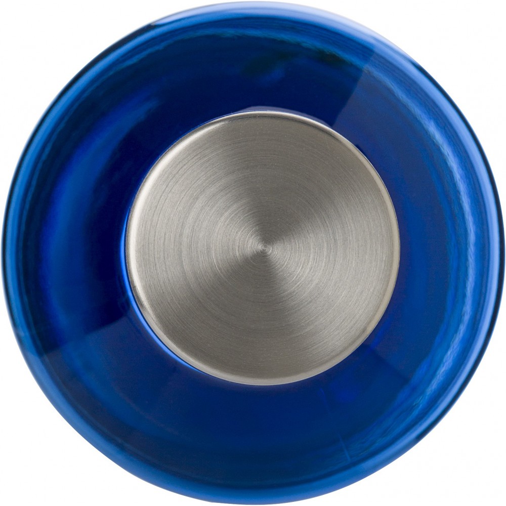 Átlátszó vizespalack fém alsó résszel és fém csavaros kupakkal. A kupak gumigyűrűje színben illeszkedik a palack színével. 850 ml. Nem szivárgásmentes. Mosogatógépben nem tisztítható. BPA-mentes műanyag. Emblémázás: Gravírozás, Körszita, Tamponnyomás