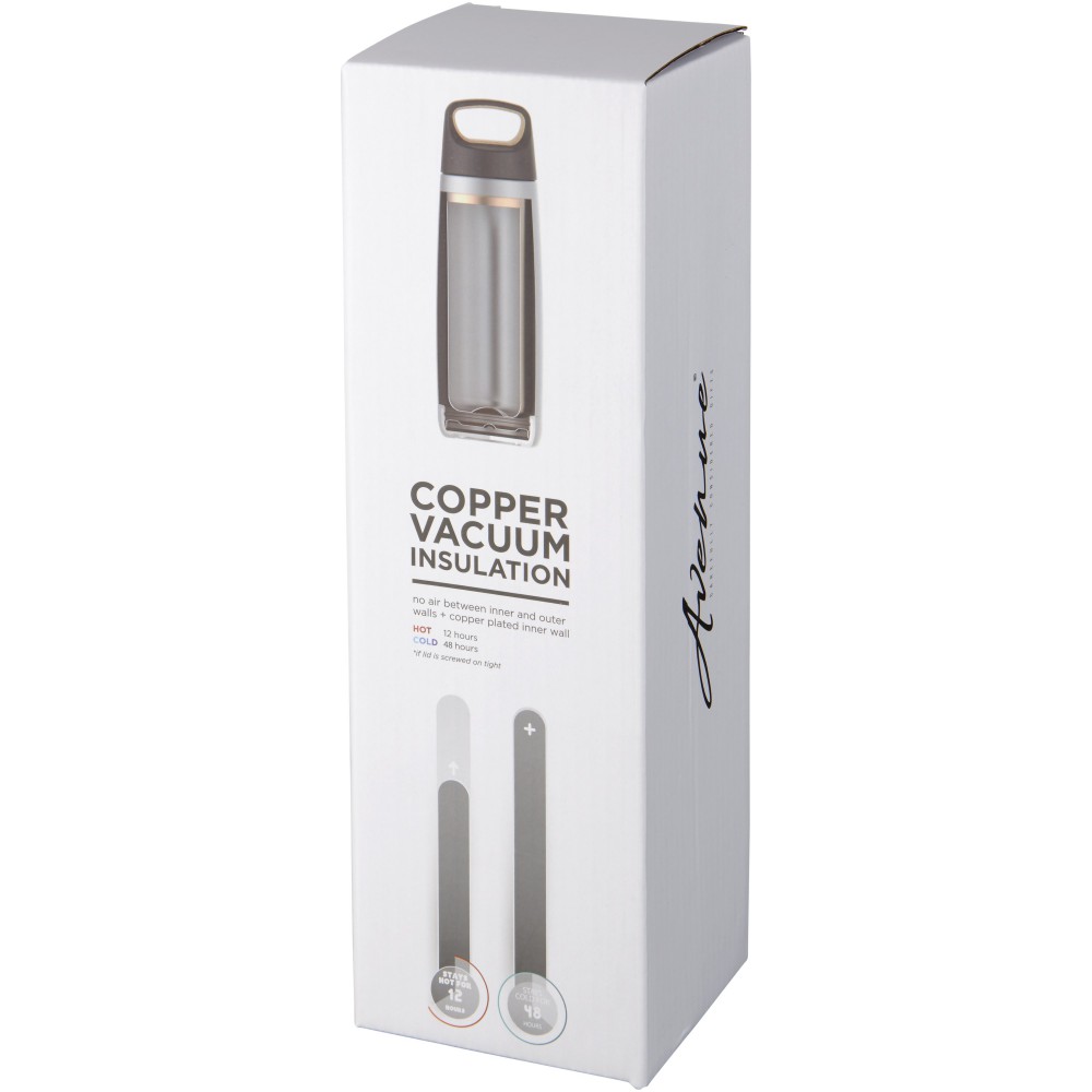 Duplafalú sportpalack réz-vákuumos szigeteléssel. Hidegtartó képesség 48 óra, melegtartó képesség 12 óra. A duplafalas kialakításnak köszönhetően nincs párakicsapódás. Csavaros fedél parafa berakással. Szivárgásmentes. Szénsavas italokkal nem használható. Mosogatógépben nem mosható és mikrohullámú sütőben történő melegítésre nem alkalmas. Űrtartalom: 600 ml. Csomagolása Avenue díszdoboz. Rozsadamestes acél és parafa. Emblémázás: Gravírozás