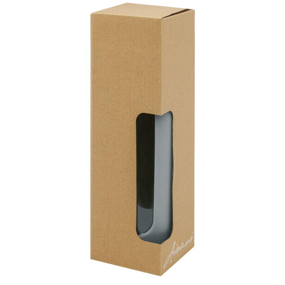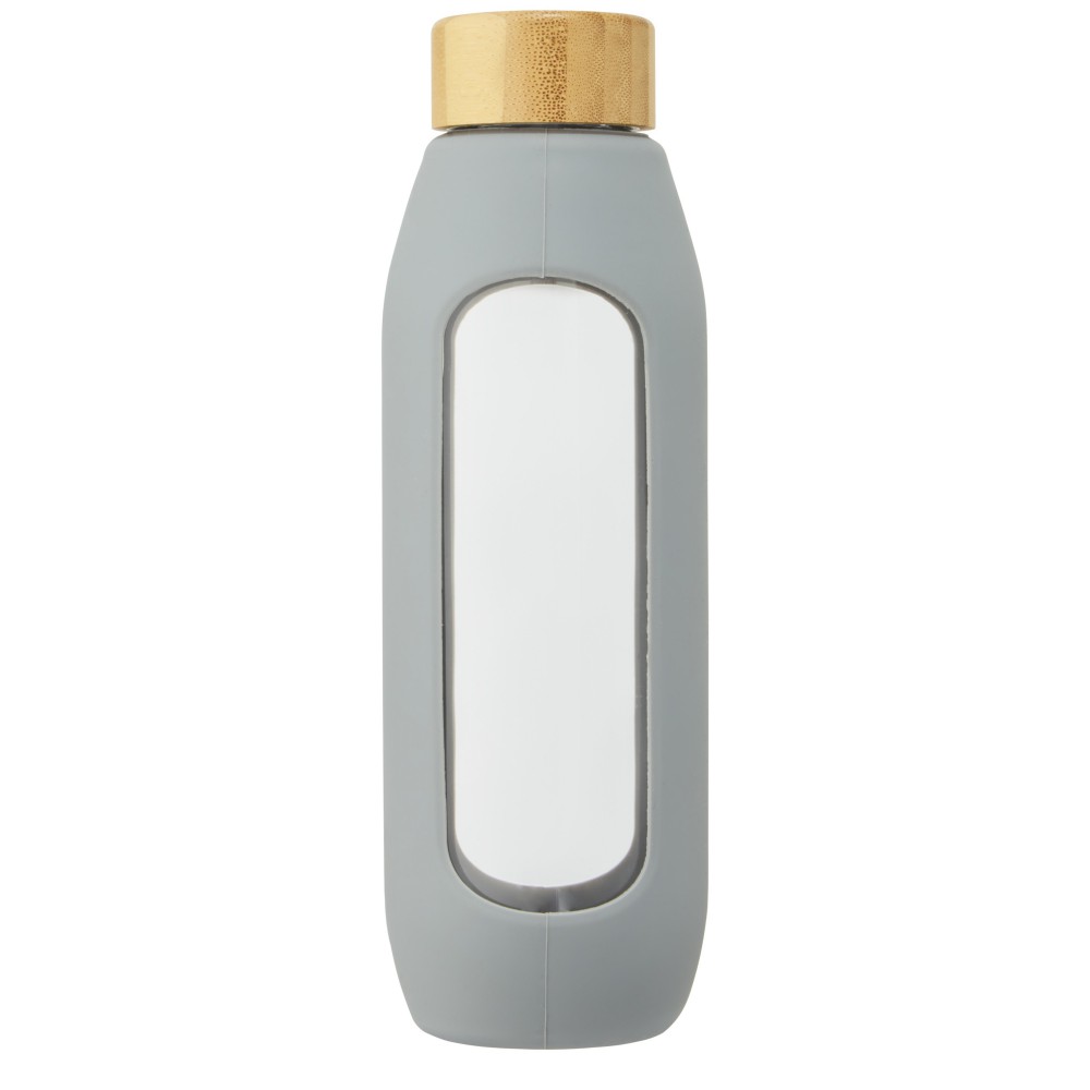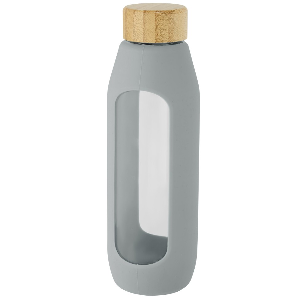 Környezetbarát újrafelhasználható vizes palack. A palack tartós boroszilikát üvegből készült, amely megőrzi a víz tiszta, igazi friss ízét, és nem tartalmaz káros vegyszereket. Szilikon markolattal és biobambuszból készült szivárgásmentes fedéllel. A német élelmiszerbiztonsági jogszabályok (LFGB) szerint tesztelték és jóváhagyták, és a REACH előírásai szerint tesztelték a ftaláttartalmat. Szivárgásmentes. Szénsavas italokkal nem használható. Mosogatógépben nem mosható és mikrohullámú sütőben történő melegítésre nem alkalmas. Űrtartalom: 600 ml. Újrahasznosított karton díszdobozban. Emblémázás: Gravírozás, Tamponnyomás