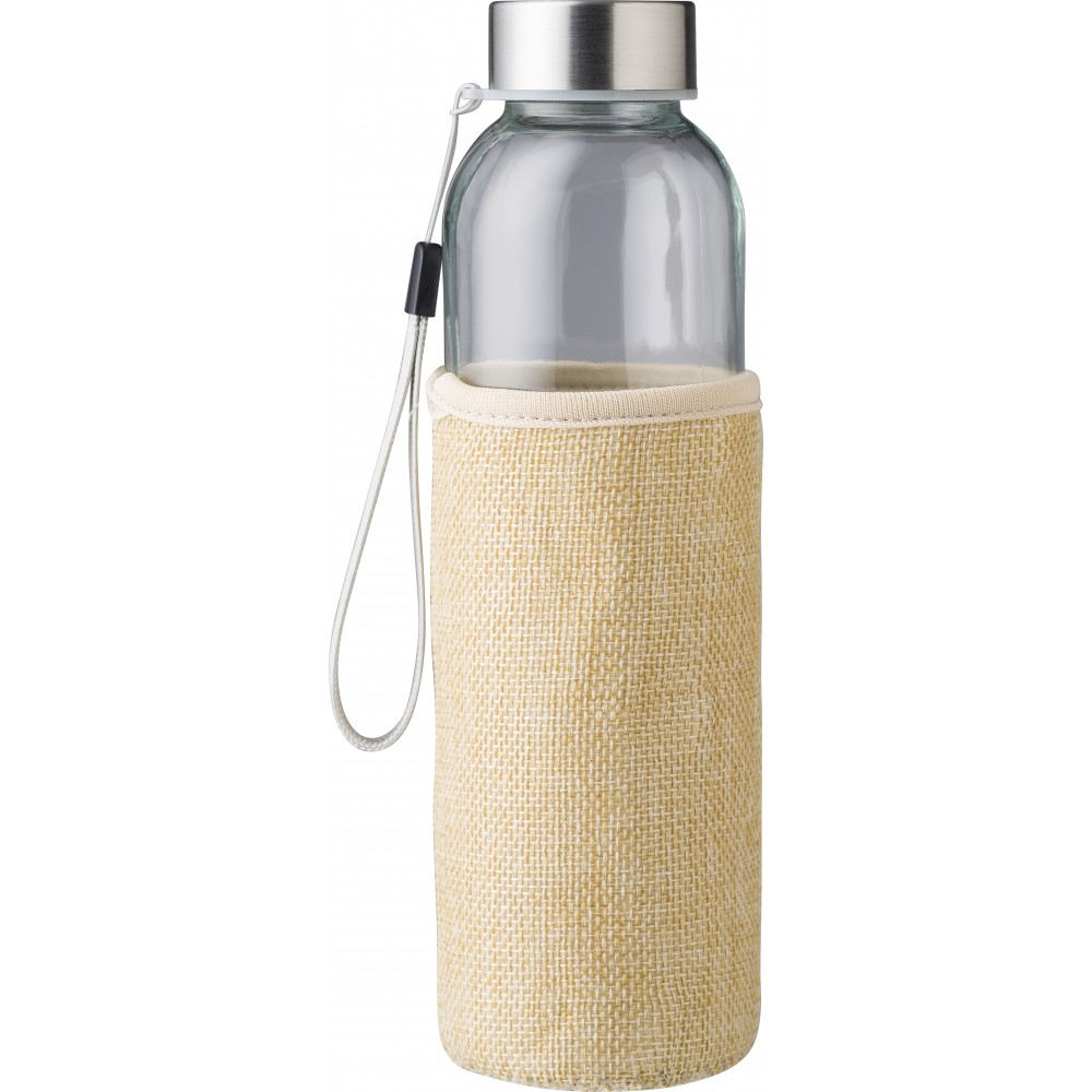 Üveg vizespalack rozsdamentes acél kupakkal, juta borítással és csuklópánttal. Csomagolása kraft papírdoboz. Űrtartalom: 500 ml. Emblémázás: Bögredekor, Gravírozás, Szitanyomás, Tamponnyomás