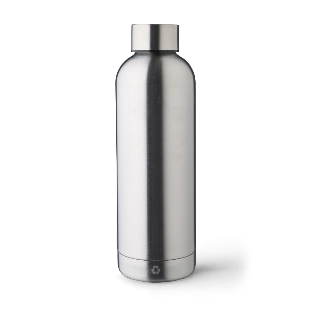 Újrahasznosított rozsdamentes acél (s/s304) duplafalú palack, matt felülettel. Barna kartondobozba egyedileg csomagolva. Űrtartalom: 500 ml. Emblémázás: Bögredekor, Gravírozás, Körszita, Tamponnyomás, UV nyomtatás