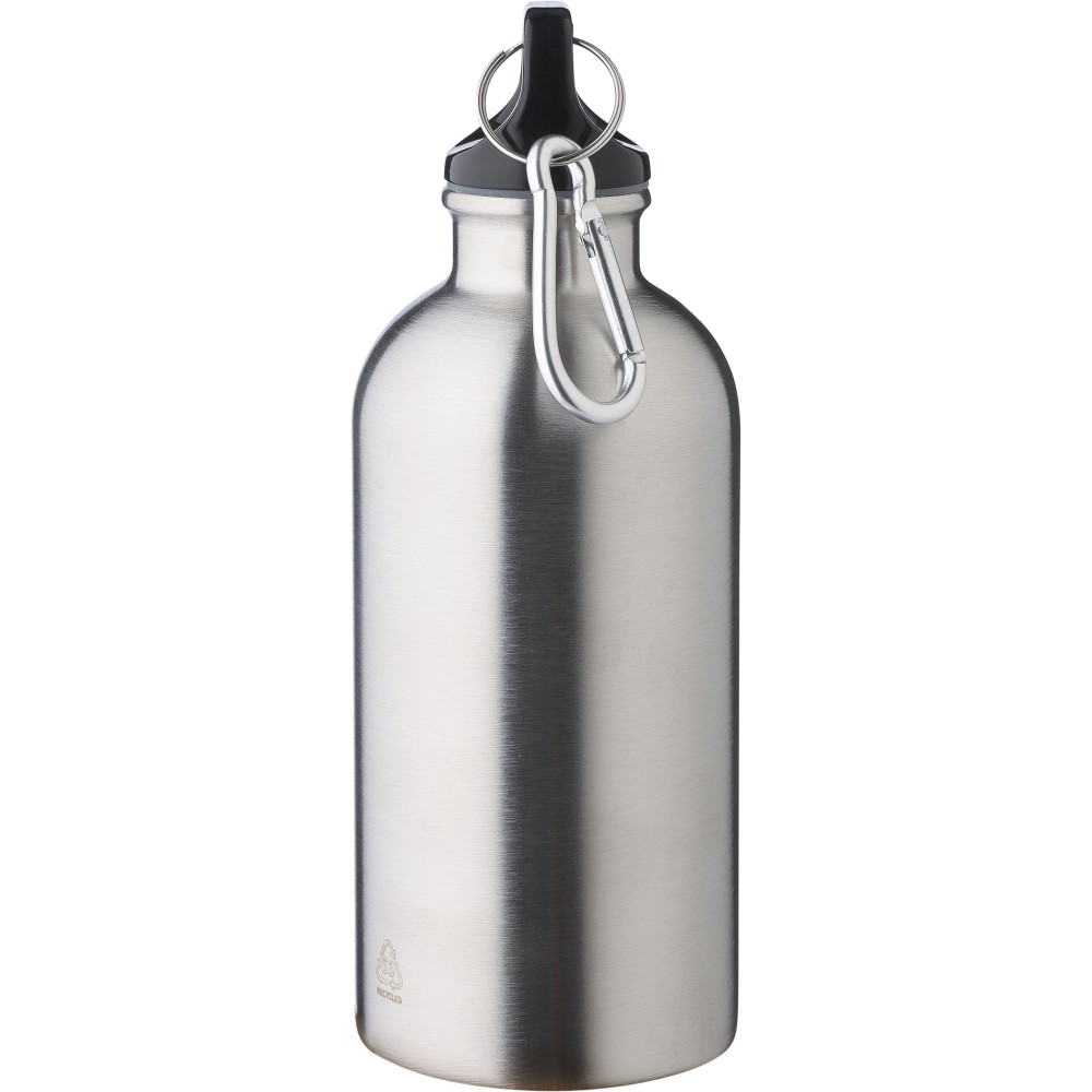 Újrahasznosított rozsdamentes acélból készült 400 ml-es szimplafalú kulacs PP kupakkal és alumínium karabinerrel. Az újrahasznosított anyagra utaló logó a palackra van gravírozva. Mosogatógépben nem tisztítható. Emblémázás: Bögredekor, Gravírozás