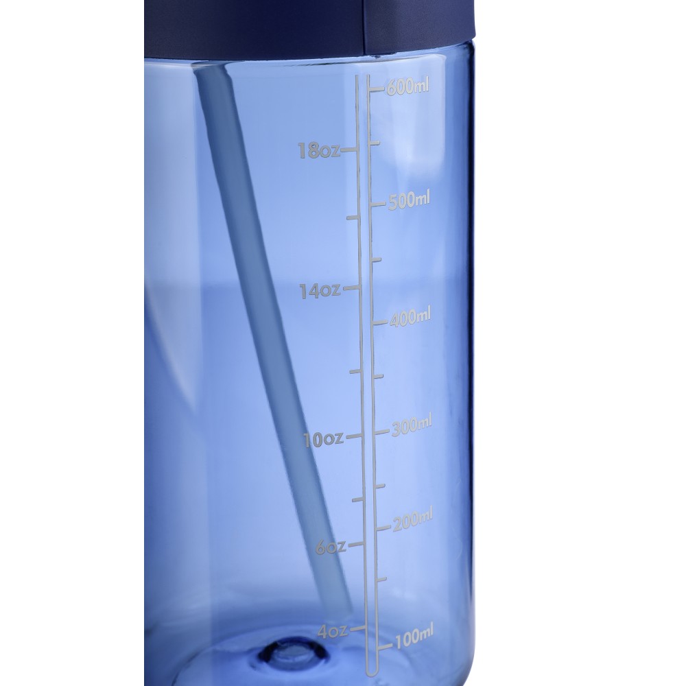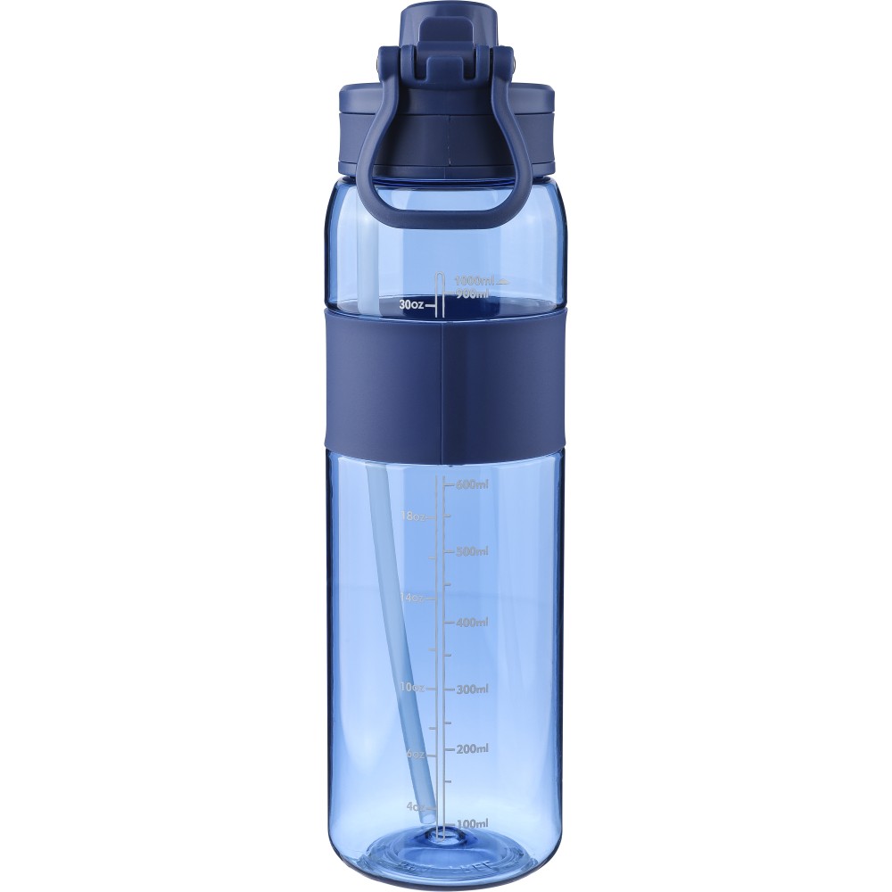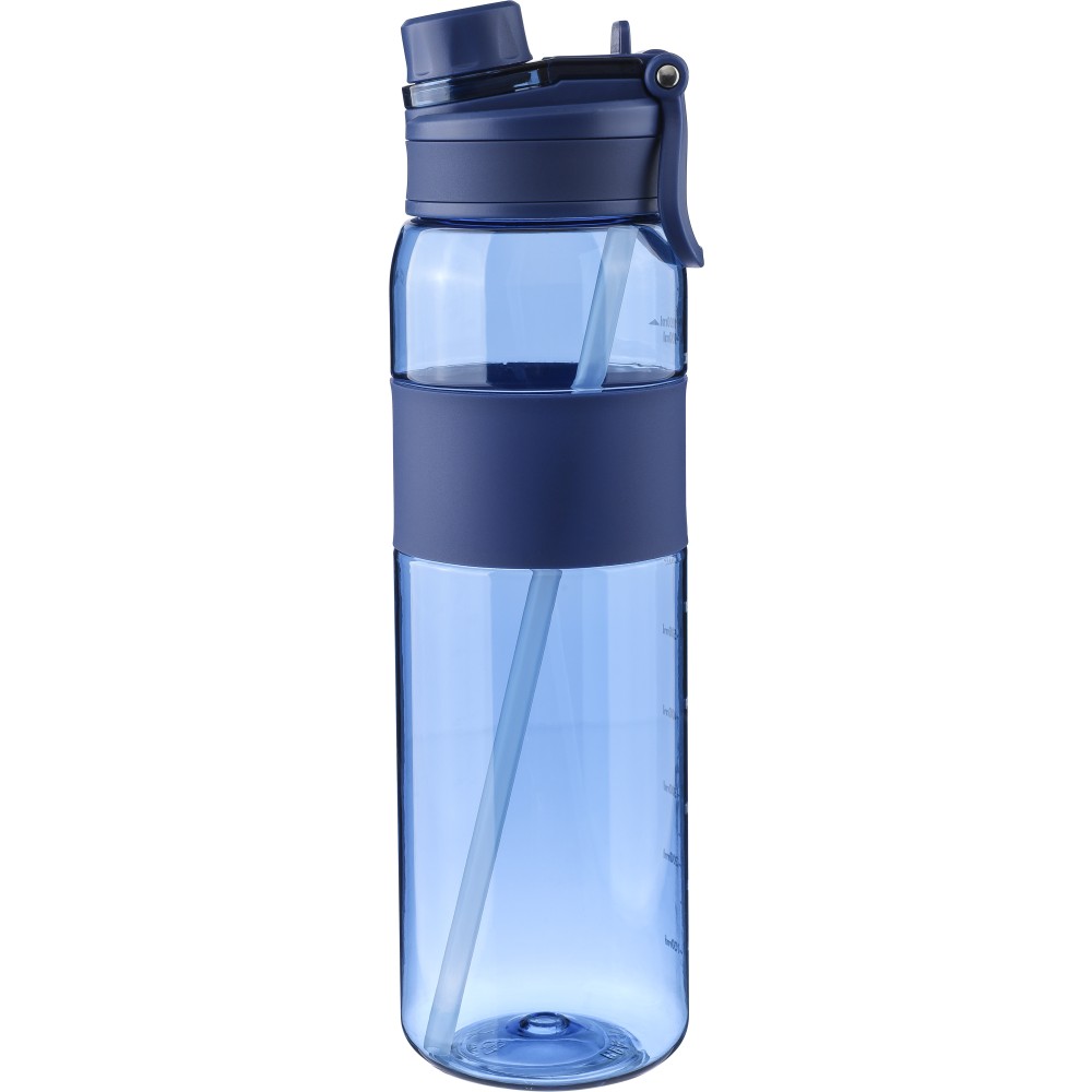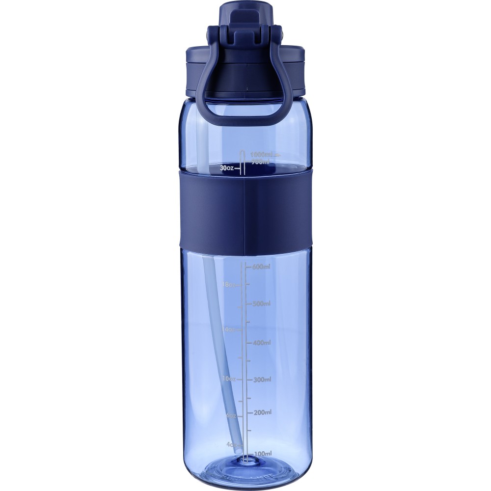Tritán kulacs, 900 ml-es. Kétféle használati lehetőséggel: csavaros záródású kupak vagy visszahajtható végű szívószál. Szilikon markolattal, PP hordozófüllel és nyomtatott űrtartalom-jelzővel. Emblémázás: Tamponnyomás